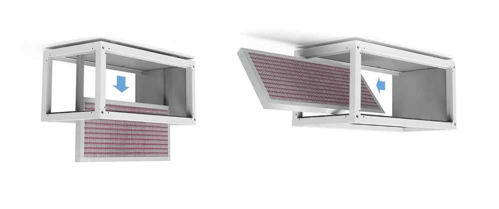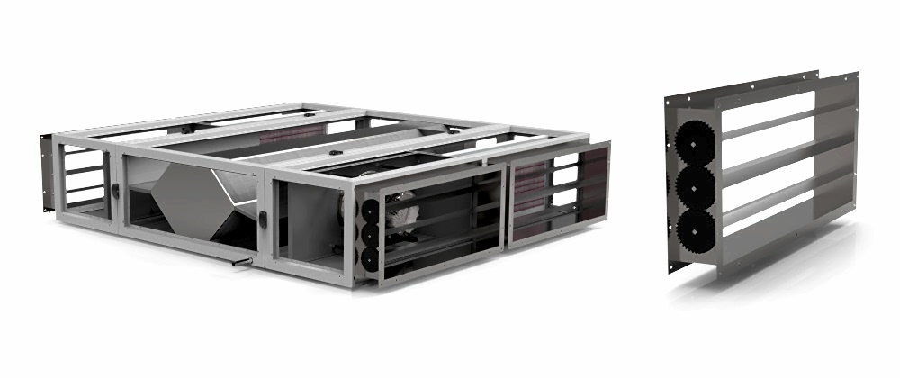 - Возможность индивидуального расширения за счет компонентов, оптимизированных по требованию, таких как глушители, нагревательные змеевики (PWW / электрические), охлаждающие змеевики (PCW / прямые расширительные Пин Ап фильтры и многое другое