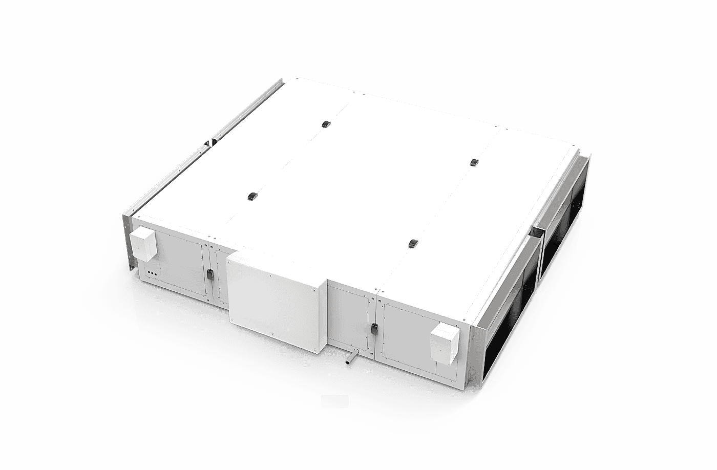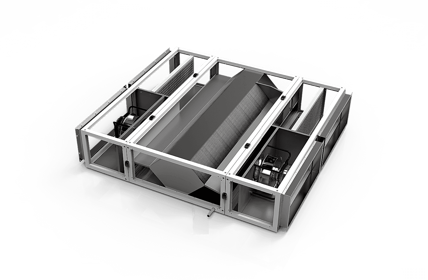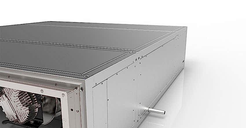 Высококачественный модуль корпуса со встроенным алюминиевым поддоном для конденсата с трехсторонним уклоном (в Пин Ап с VDI 6022) в направлении бокового отвода конденсата.